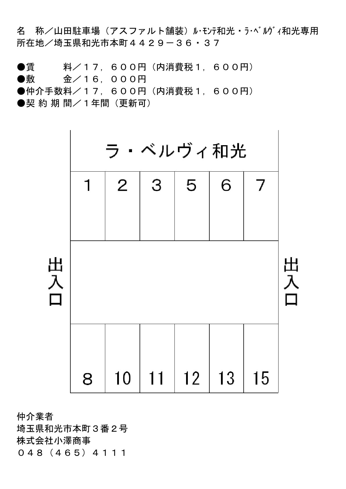 ※別途、賃料・敷金に消費税10%(1,600円)がかかります。 ※(ル・モンテ和光、ラ・ベルヴィ和光、コーポ山一)専用駐車場になります。 駐車場の空き待ち予約の受付、空き予定のご連絡を行っておりません。 何卒ご了承くださいますようお願い申し上げます。 ※大型車(車幅1,800以上)につきましては、空き区画の状況により、お断りさせて頂く場合がございます |